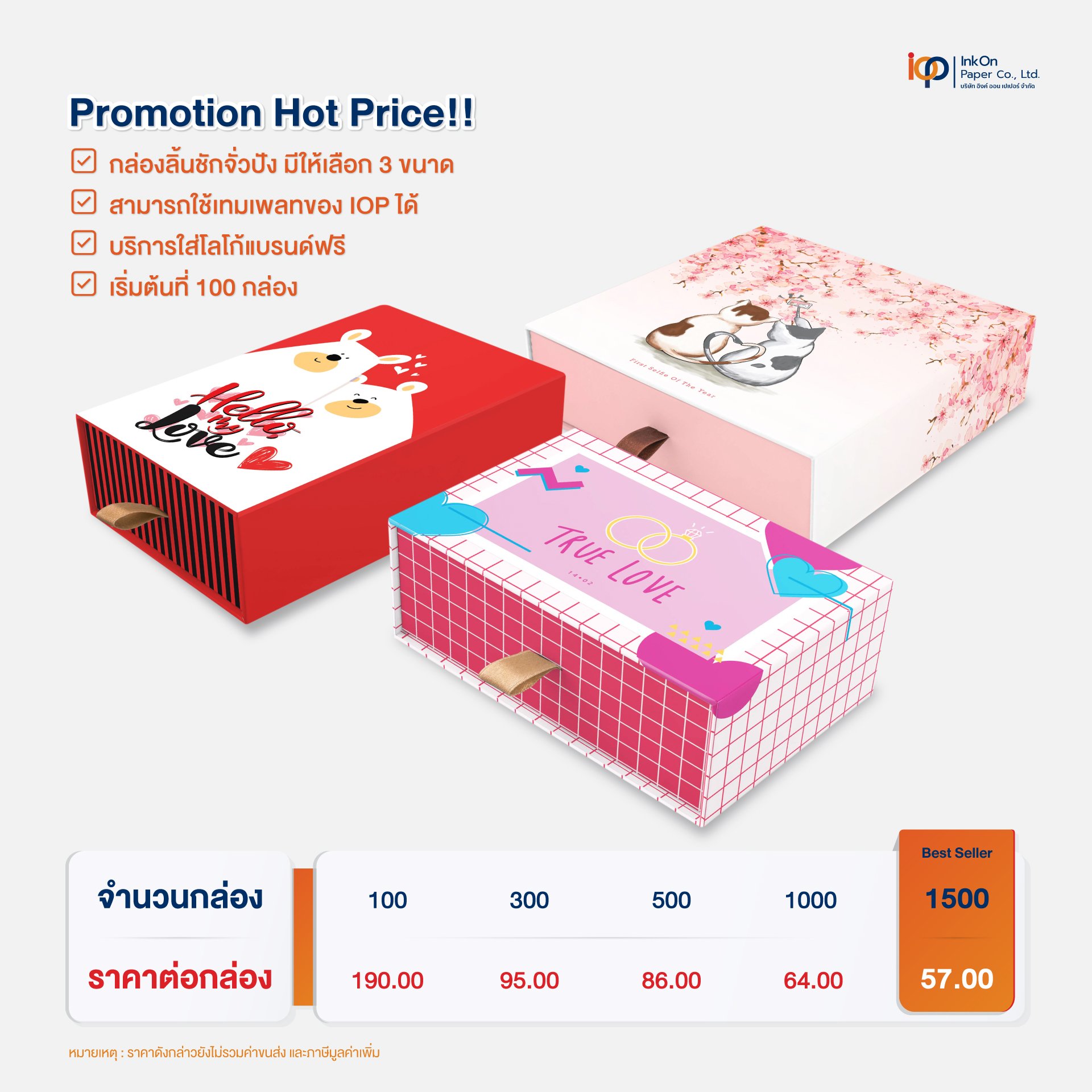 กล่องลิ้นชักขนาดมาตรฐานของ IOP มี 3 ขนาด พร้อมพิมพ์ลายสุดคิ้วท์ เหมาะสำหรับใส่สินค้า หรือใส่ของพรีเมี่ยม โดยลูกค้าสามารถเลือกแบบที่ต้องการ พร้อมบริการใส่โลโก้แบรนด์ให้โดยไม่มีค่าใช้จ่าย