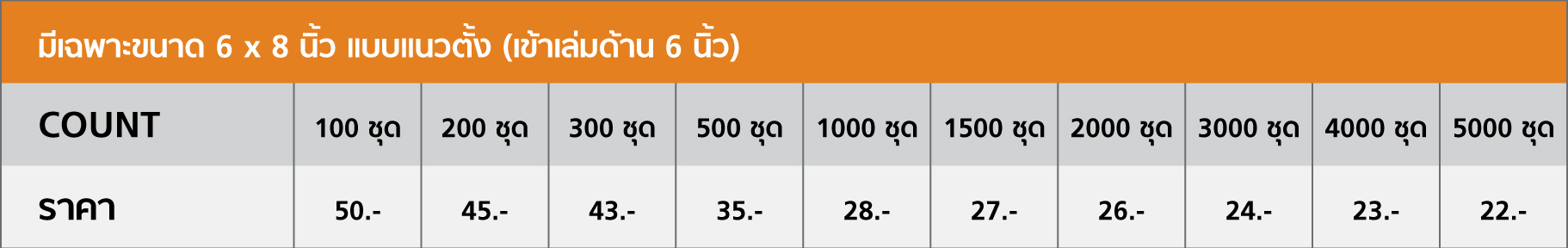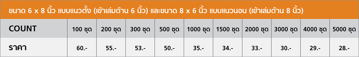 มีเฉพาะ 6 X 8 นิ้ว แบบแนวตั้ง (เข้าเล่มด้าน 6 นิ้ว)